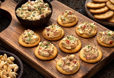 Si queremos un tentempié que tenga un toque de elegancia, como un snack para servir en bandeja y repartir a unos cuantos invitados, los bocaditos son perfectos. Nuestro consejo es usar una galleta salada pequeña o mini tostadas, que servimos con una mezcla de atún y verduras. Lo ideal es que cada pieza se pueda comer en uno o dos bocados, por eso su nombre.
