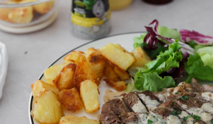 - 5.Servir la carne junto con la salsa, las papas y opcionalmente ensalada.